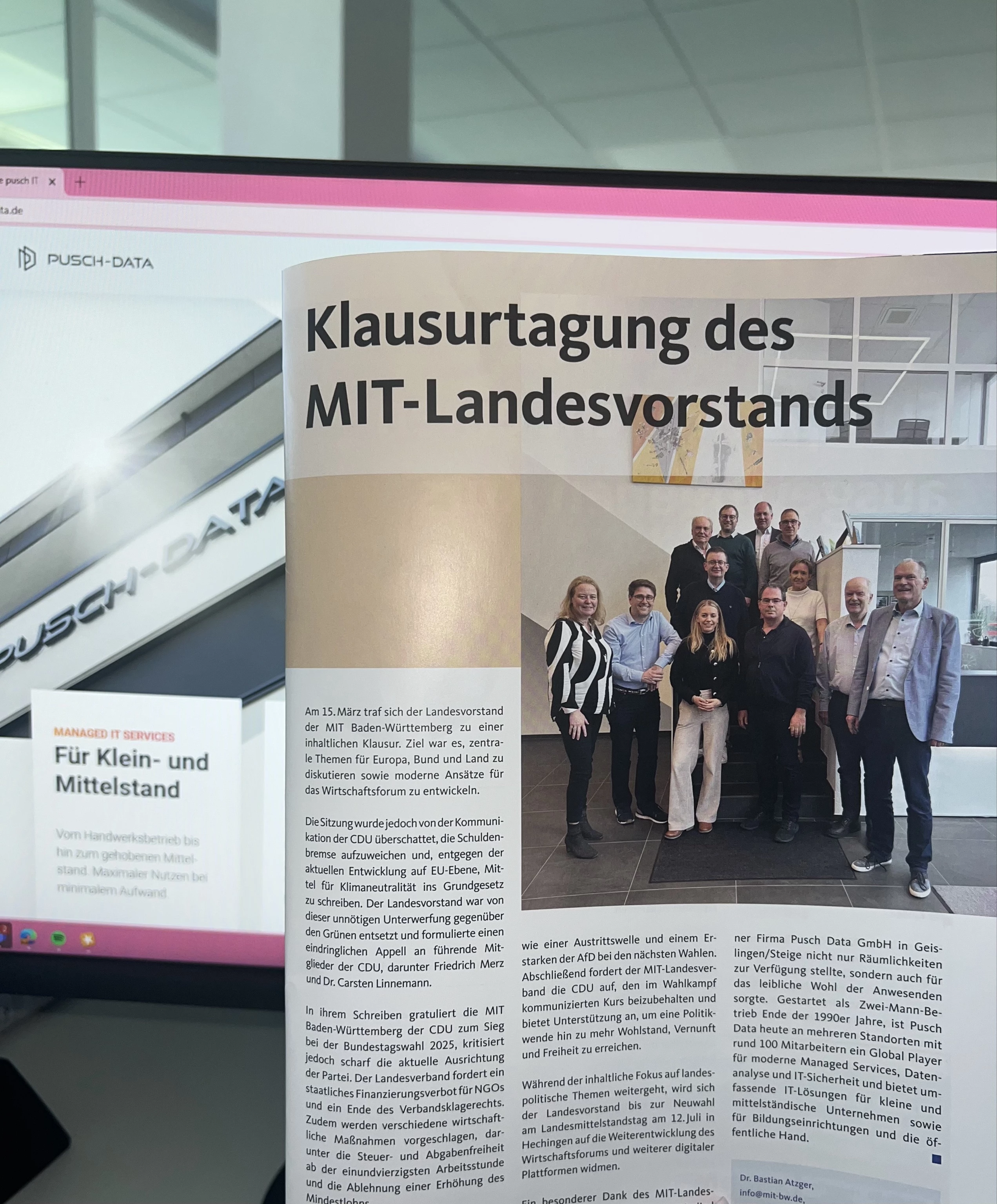 Am 15. März 2025 traf sich der Landesvorstand der Mittelstands- und Wirtschaftsunion (MIT) Baden-Württemberg zu einer inhaltlichen Klausur in den Räumlichkeiten der Pusch-Data GmbH. Ziel war die Diskussion zentraler Themen für Europa, Bund und Land sowie die Weiterentwicklung des Wirtschaftsforums.