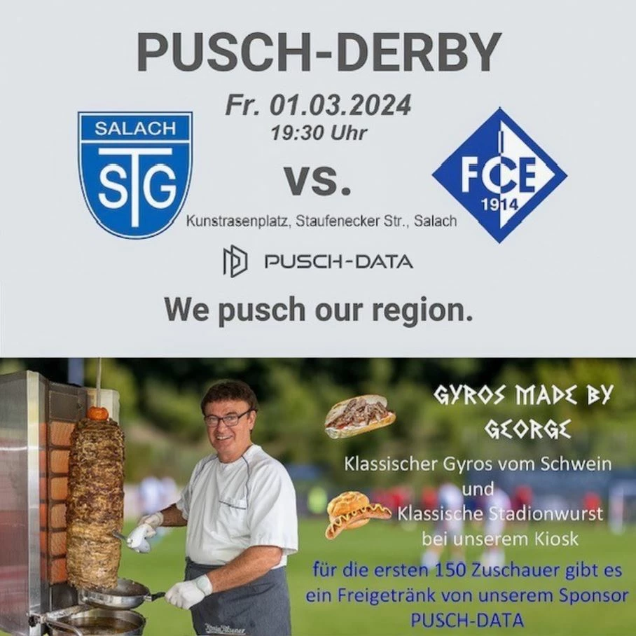Am Freitag, den 01.03.2024 fand zwischen unseren beiden Sponsoringpartnern TSG Salach und dem 1. FC Eislingen ab 19:30 Uhr das Pusch-Derby statt. ⚽